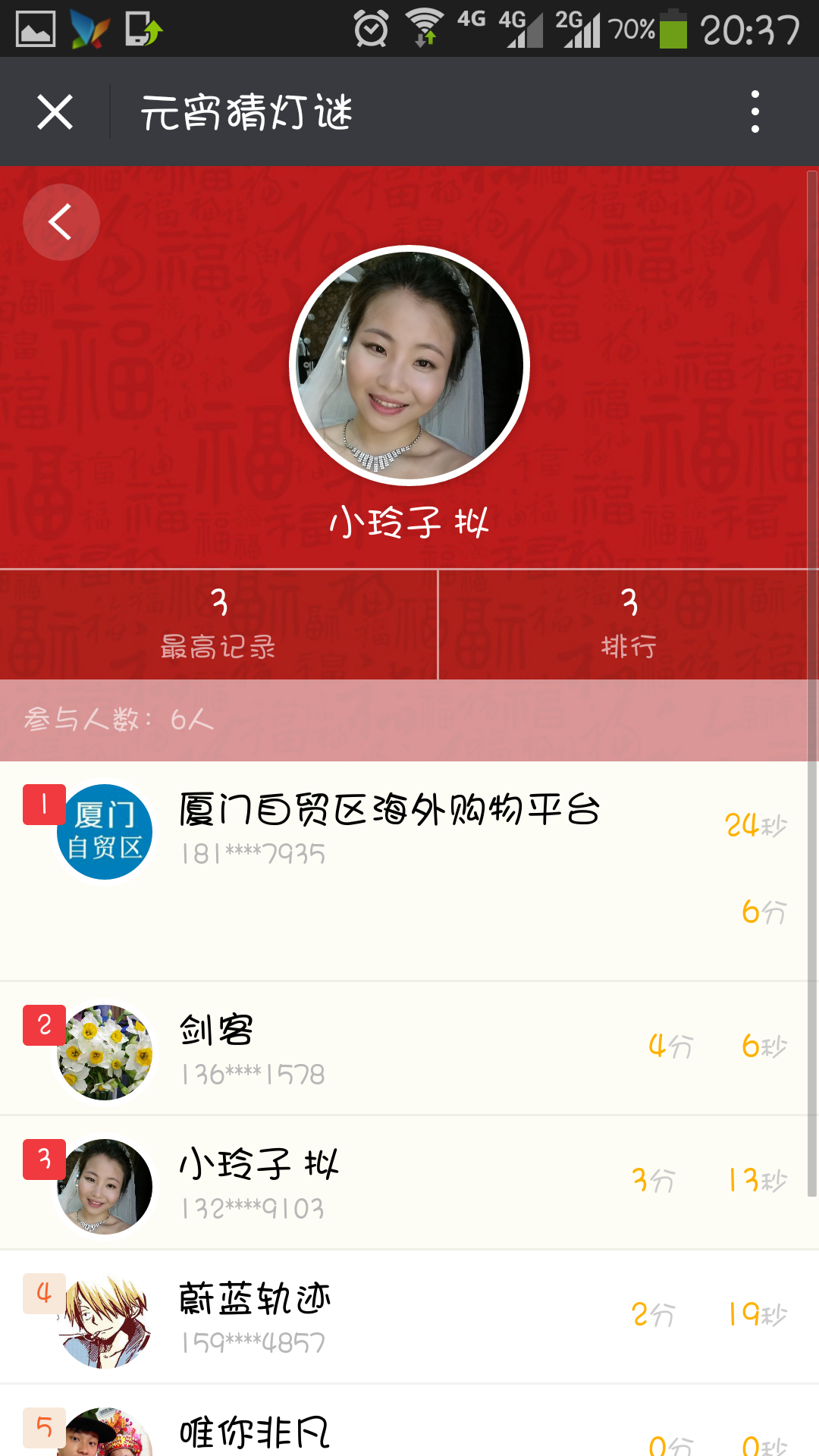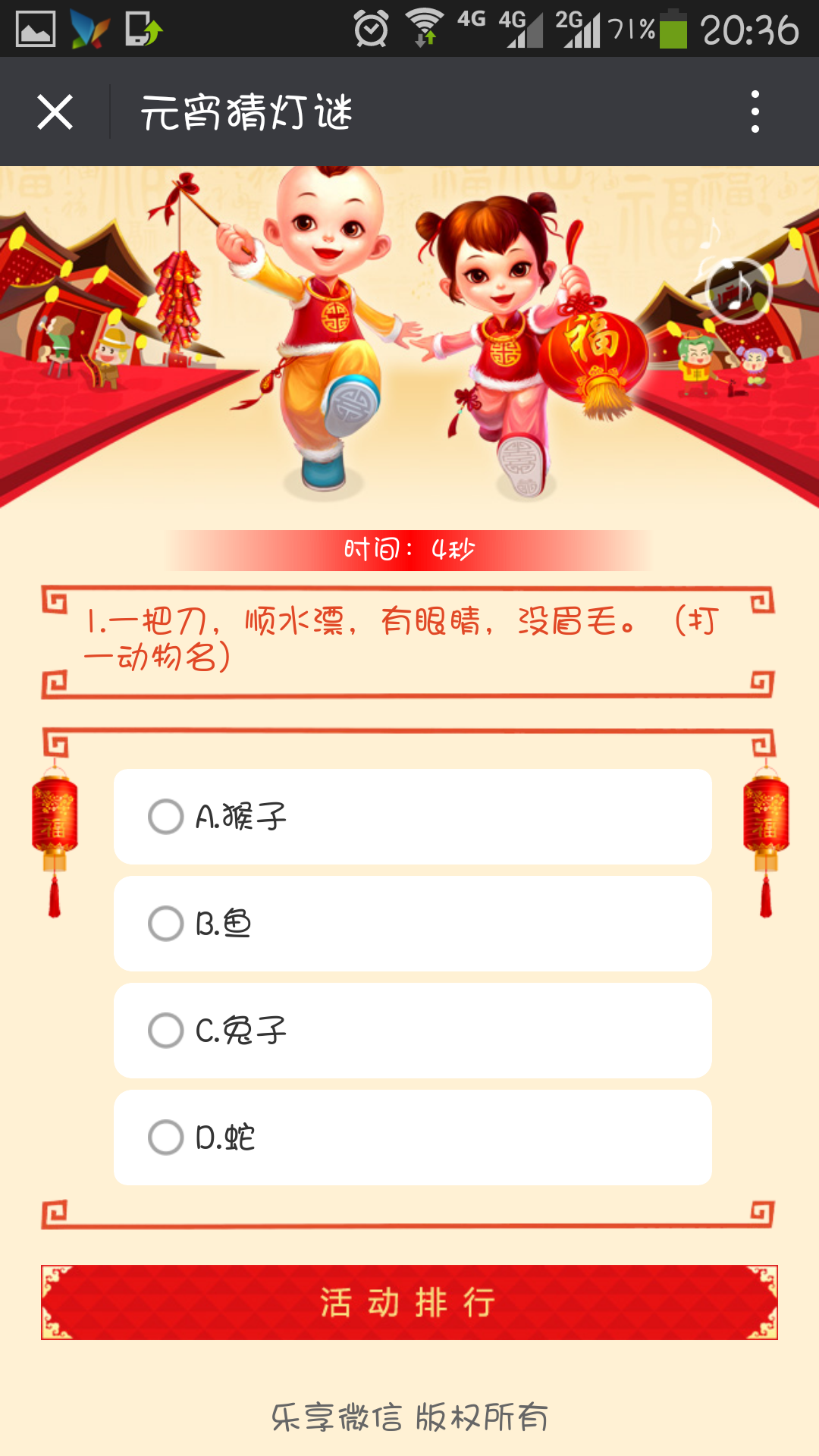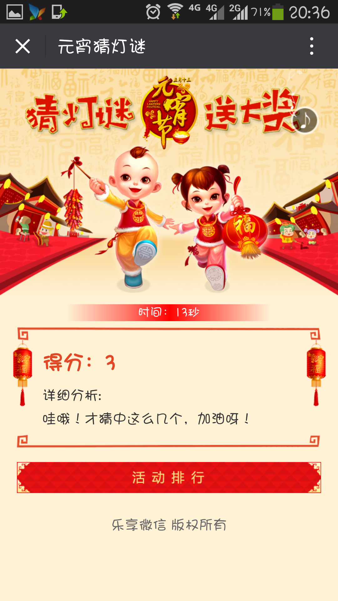 猜灯谜又称打灯谜,是中国独有的富有民族风格的一种汉族民俗文娱活动形式,是从古代就开始流传的元宵节特色活动。每逢农历正月十五,汉族民间都要挂起彩灯,燃放焰火,后来有好事者把谜语写在纸条上,贴在五光十色的彩灯上供人猜。因为谜语能启迪智慧又迎合节日气氛,所以响应的人众多,而后猜谜逐渐成为元宵节不可缺少的节目。灯谜增添节日气氛,展现了古代汉族劳动人民的聪明才智和对美好生活的向往。每人可以参加一次活动,所花时间越短排名越前,可获得丰厚奖品。